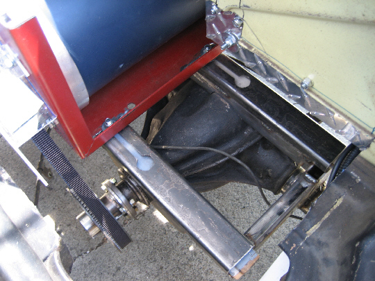 The motor, being basically a cylinder, was very difficult to mount. The red painted metal form was the only thing I had made for me. (I dont have the metal bending tools.) Although difficult to see, there is a 4inch hole cut in the front of the red metal form and the front part of the motor rests on that - the four bolts - threading into the aluminum motor housing are not taking the 70lb weight of the motor. The back of the motor is supported with four bolts and the whole thing rests on two parallel 2x1 rectangular tubes with orthogonal slots cut to allow for adjustment, belt tensioning and alignment.