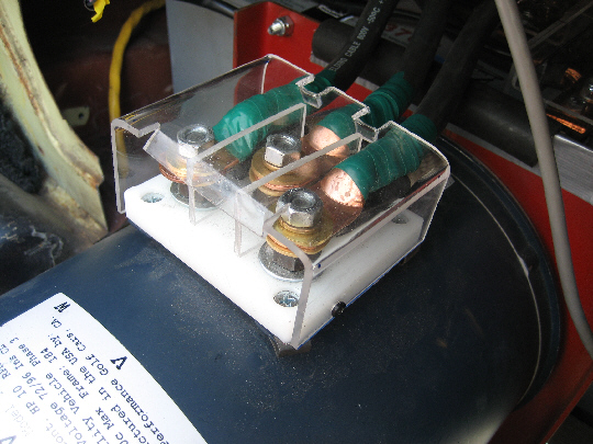 More perspex protection over the battery terminals. The thick cable is 2/0 welding cable and the thinner black cable is for the chargers. The thinnest cable is for the instrumentation (measuring the voltage of the batteries, that is).