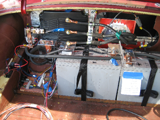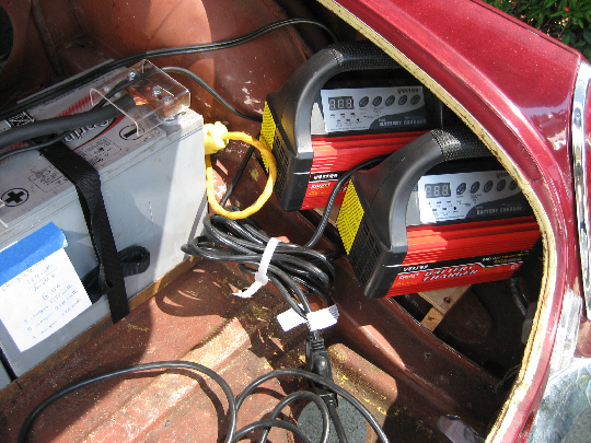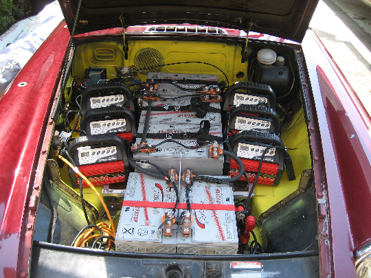 Here's the front of the car - you should have seen the expression on the face of the DMV inspector when I opened the hood:). For those paying attention you'll notice that there are six chargers and only five batteries. The sixth battery is hidden below. There are two batteries in the back. This 6 and two arrangement made the ride height of the car pretty much the same as it was originally. The batteries are secured at their base with metal brackets and then strapped down with roof-rack straps. The arrangement seems to work.