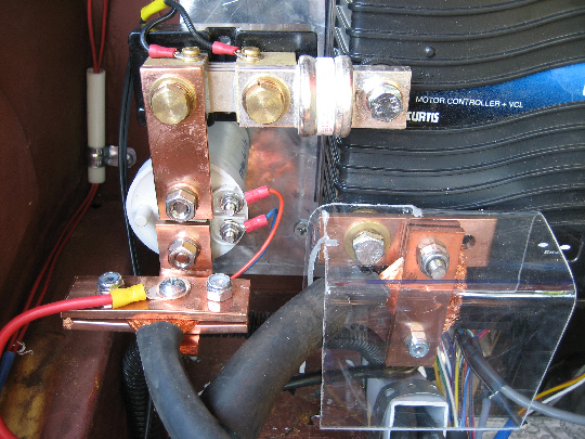 Here is the Curtis controller, the 400Amp fuse, shunt for measuring the current flow, the 'contactor' (a relay) (the white cylinder unit) and a bunch of copper bar connections. Being a bit concerned about the proximity of the positive and negative cables, I covered negative supply with extra tubing. A short would not be good - I'd be using my fire extinguisher if contact was made. The perspex cover is there to stop accidental shorts when tightening bolts etc.