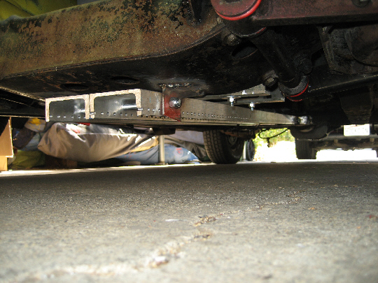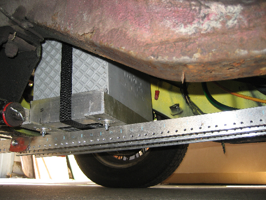 Here's the one battery at the front, underneath. All the brackets are aluminum - thanks to Sims Metal recyclers for the supply.