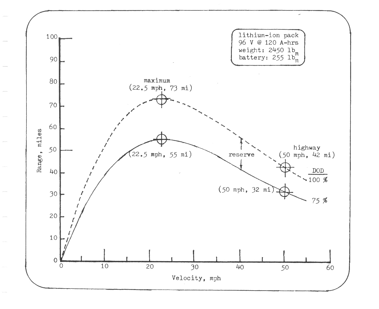 An upgrade option for the MGB electric sports car with a lithium-ion pack rated at 96 V @ 120 A-hrs; stored energy: 11.52 kW-hrs. For 75 % depth of discharge, maximum range is 55 miles at 22.5 mph; and at a highway speed of 50 mph, range is 32 miles. Operating to 75 percent depth of discharge allows for a reserve of 10 to 18 miles to drive to a charging station. Cycle life at 75% DOD is 2245; and mileage to battery failure is 71840 mi. For driving 30 miles daily, lifetime becomes 6 1/2 years.