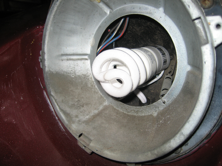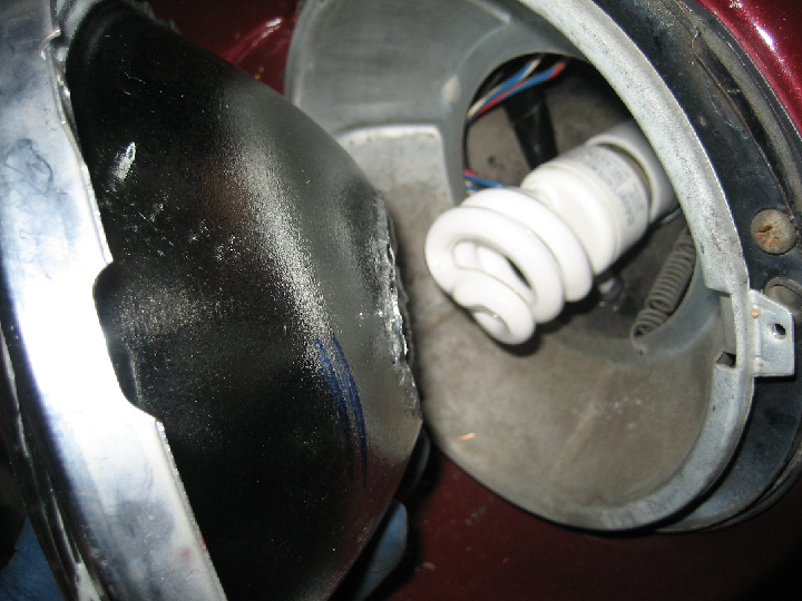 Next I took out the old headlight (a sealed beam standard 7" round unit) and carefully ground out the internal bulb components. With a diamond 4" angle grinder attachment this was much easier than I had expected - it only took 2 minutes to produce a ragged but mostly circular hole. Rather fortunately, this hole is pretty much the perfect size for a CFL curly bulb.