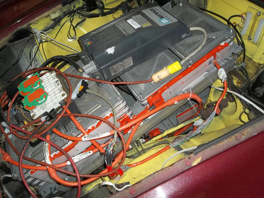 Lithium battery upgrade! I now have half a Nissan Leaf battery pack installed. These batteries were kindly given to me by my co-ev conversioner Vijay. He purchased two totaled (written off) Leafs from the auction with the intention of converting an MGB-GT. You can see a description of this GT conversion below. As for my MGB roadster I have much better range (about 40 miles) and the car just performs much better. The batteries are much 'stiffer' than the old lead acid.