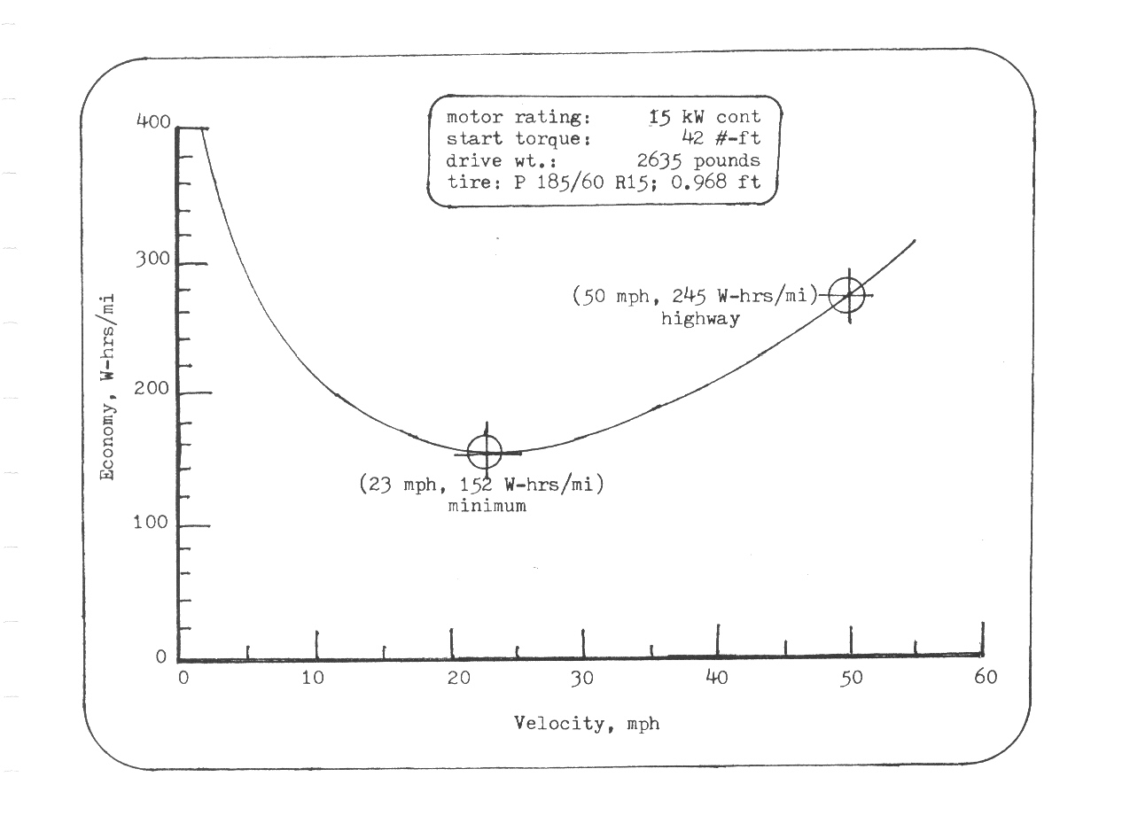Economy of energy usage for the MGB electric sports car with a lithium-ion, iron phosphate, battery pack of twenty eight cells. Battery rated: 112 V @ 280 A-hrs, 511 pounds, pack weight. Economy is only slightly less than the original vehicle with a 576-pound, lead-acid, battery: 96 V @ 100 A-hrs. Minimum economy occurs at 23 mph with a value of 152 W-hrs/mi. At a highway speed of 50 mph, economy increases to 246 W-hrs/mi. Economy increase below 23 mph is due to motor efficiency decreasing at low power output. The economy increase above 23 mph is due to the aerodynamic drag at high speeds. The somewhat high values of economy are attributed to the rather large drag coefficient of 0.602 for the open-cab sports car design.